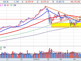 미국 10년만기 국채금리에 대한 우려와 기업 실적의 상승이라는 두가지의 상반된 재료로 인해 미국 뉴욕증시도 등락을 반복하고 있으나, 전체적으로는 그간 2년간 혹은 더 장기적인 주가 상승후에 오는 꽤 깊은 조정장에 있다는 것을 염두에 두고, 현재의 지수 위치가 대하락장에서 나타나는 잠시의 반등장이 될지, 아니면 눌림목 조정기간이 될지 유의깊게 살펴볼 필요가 있는 구간이다.