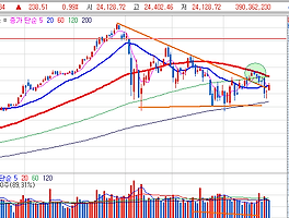 어제 장대음봉에 가까운 급락을 보이다가 반등하는 모습을 보여 급락은 막아선 모습. 가격 하락 저항대 위에서 반등 모습 연출해서 그나마 지수에 긍정적 모습을 연출했다.