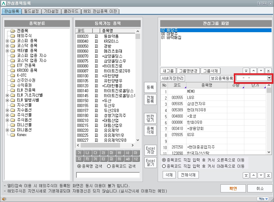 2. 오른쪽 섹션 중간에 있는 보유종목등록 버튼 오른쪽 선택박스를 클릭하면 본인의 증권계좌가 뜬다. 선택한후 왼쪽의 보유종목등록 버튼을 클릭하고, 창 맨아래 '확인' 버튼을 클릭하면 관심종목 창에 본인이 매수한 종목의 단가, 수량 등의 정보가 뜬다.