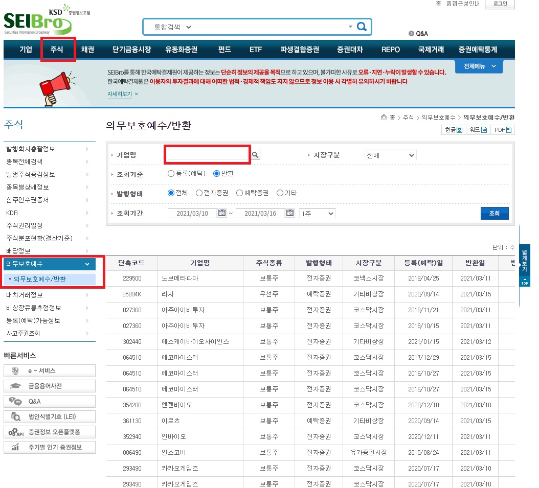 내가 사려는 종목이 이런 보호예수가 있는지 확인하려면 증권정보포털 사이트인 세이브로에 가서 확인할수 있다. (▷SEIBro)