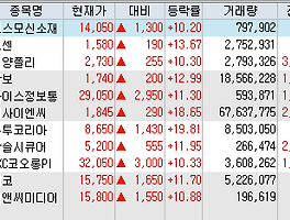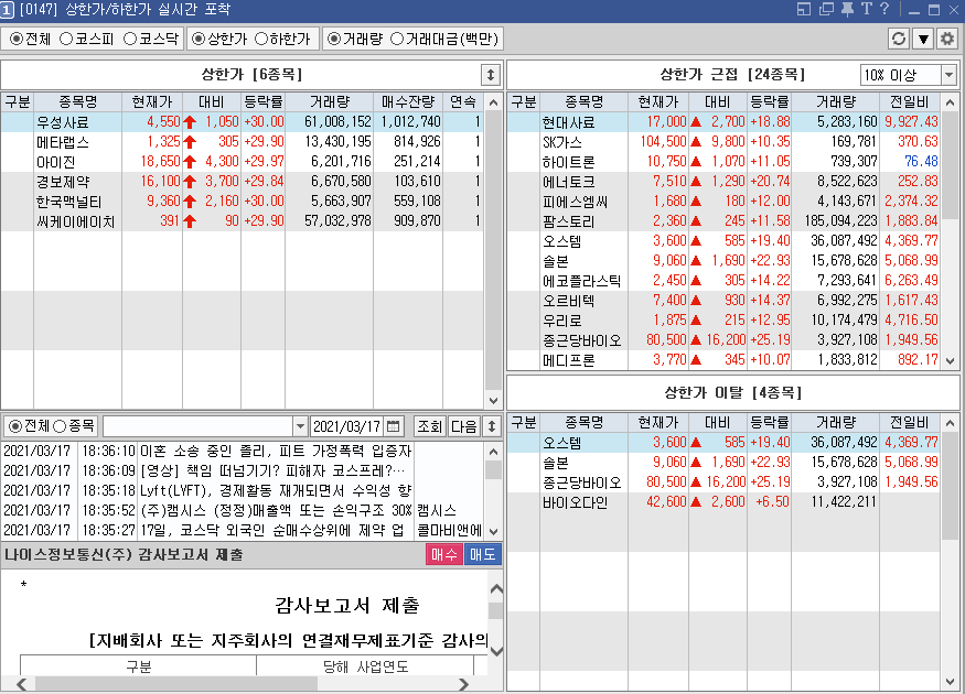 키움증권의 영웅문 HTS를 보면 매일 상한가와 급등주를 보여주는 실시간 급등주 창[0147]이 있다. 급등주를 공략하기 위해서는 매일 이들 급등주들을 정리해보면서 급등주 패턴을 공부하는 것이 우선이다.
