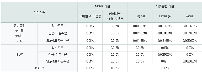 NH 나무 수수료는 현재 나무앱을 통해 모바일 계좌 개설시 수수료가 0.01%다. K뱅크나 카카오뱅크를 이용해서 증권계좌개설시에는 0.015%가 적용된다. 제휴은행을 통해 가입시에는 0.0141639%.