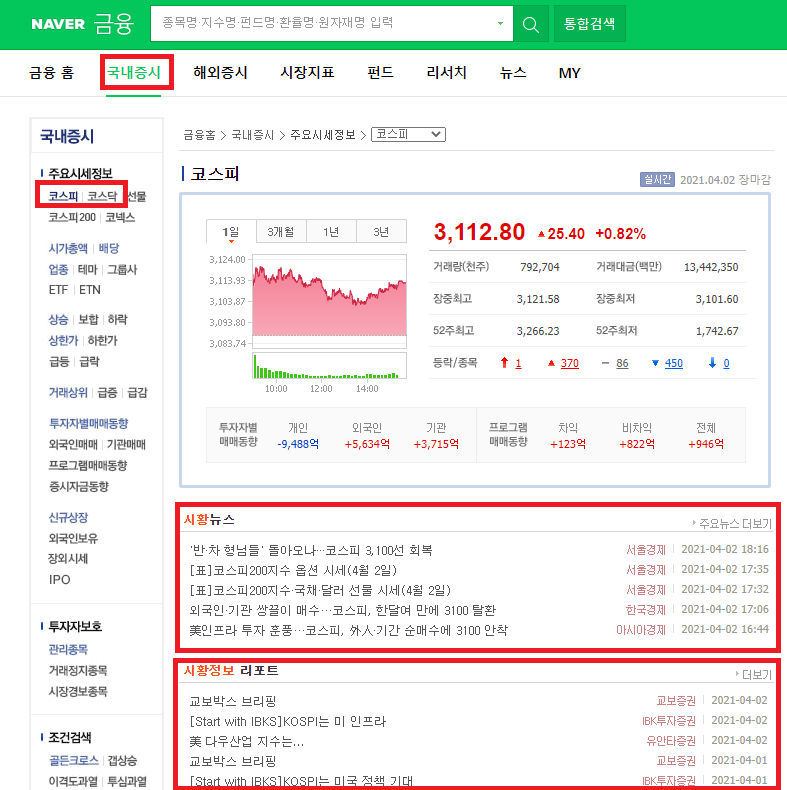 네이버 > 증권 > 국내증시 > 코스피/코스닥 메뉴를 확인하자. 시황뉴스를 보고 경기를 분석하는 것은 사실 전문가가 아니라면 예측이 쉽지 않다. 오랜 기간 경제를 보는 눈을 키워야 한다. 주식 초보의 경우 시황뉴스와 더불어, 시황정보에 대해 분석해 놓은 증권사 리포트를 이용하라.