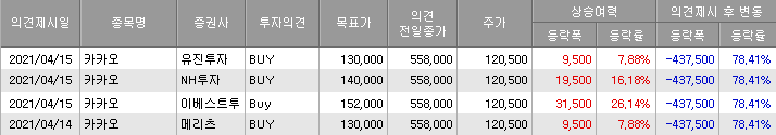 4.15일 오늘 주식 분할후 거래재개된 카카오에 대한 증권사별 목표주가를 보면 4개의 증권사에서 13만원, 14만원, 15만원을 고루 제시하고 있다.