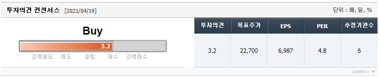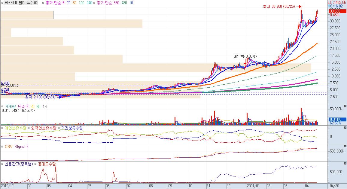 선박 물류의 활성화로 증권가에서 내놓은 목표주가 22700원보다 훨씬 주가가 높은 위치에 있다. 주의가 요망된다. 물론 주식을 오래하다보면 오르는 주식은 목표주가를 훨씬 뛰어넘어 지속적으로 상승하는 경우도 많으나, 현재는 공매도가 금지되어 있던 특수상황에서 공매도가 재개되는 분명한 하락 모멘텀이 있는 시기이므로 조심할 필요가 있다.
