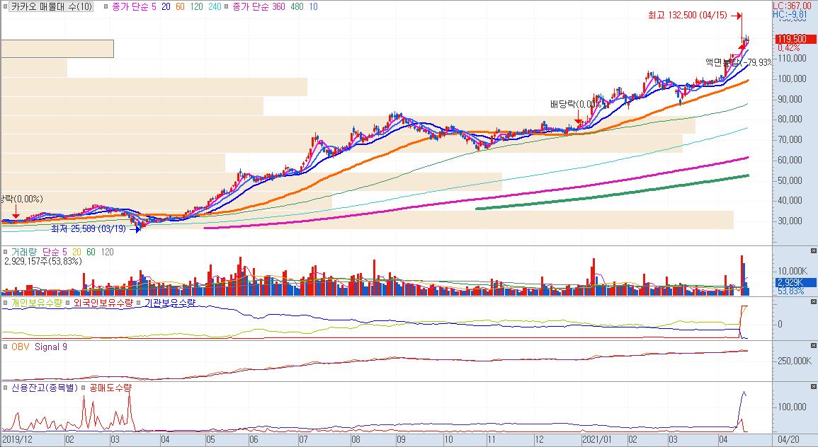 카오는 목표주가가 평균 12만2157원이다. 현재 주가는 11만9500원으로 다소 하락했으나 여전히 목표주가를 상회했다가 현재는 고점부근이다.