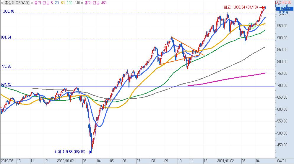 단기간 코스닥 지수가 조정 받을 수 있다는 것을 염두에 두고 투자에 나서야 겠다. 또한 5월 3일 공매도 재개가 지수 조정의 주요한 모멘텀으로 작용할 수도 있다는 것을 생각해 두고 대응해야 겠다. 만약 공매도 재개로 인한 주가 재조정시에는 1000포인트 아래로 다시 하락 나올수 있는 깊은 조정이 나올수도 있다.