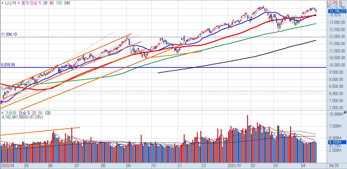 명목상의 미국 증시 하락 원인은 코로나 재확산과 백신보급 지연으로 인한 코로나 사태가 지속될 것이라는 이유다. 나스닥 지수를 보면 작년 9월의 조정이후 계속된 상승세를 보이다가 올해 2월부터 다시 조정을 보이다가 이번에 전고점 부근에서 다시 하락하고 있다. 20일과 60일 이평선 까지는 빠질것으로 보인다.