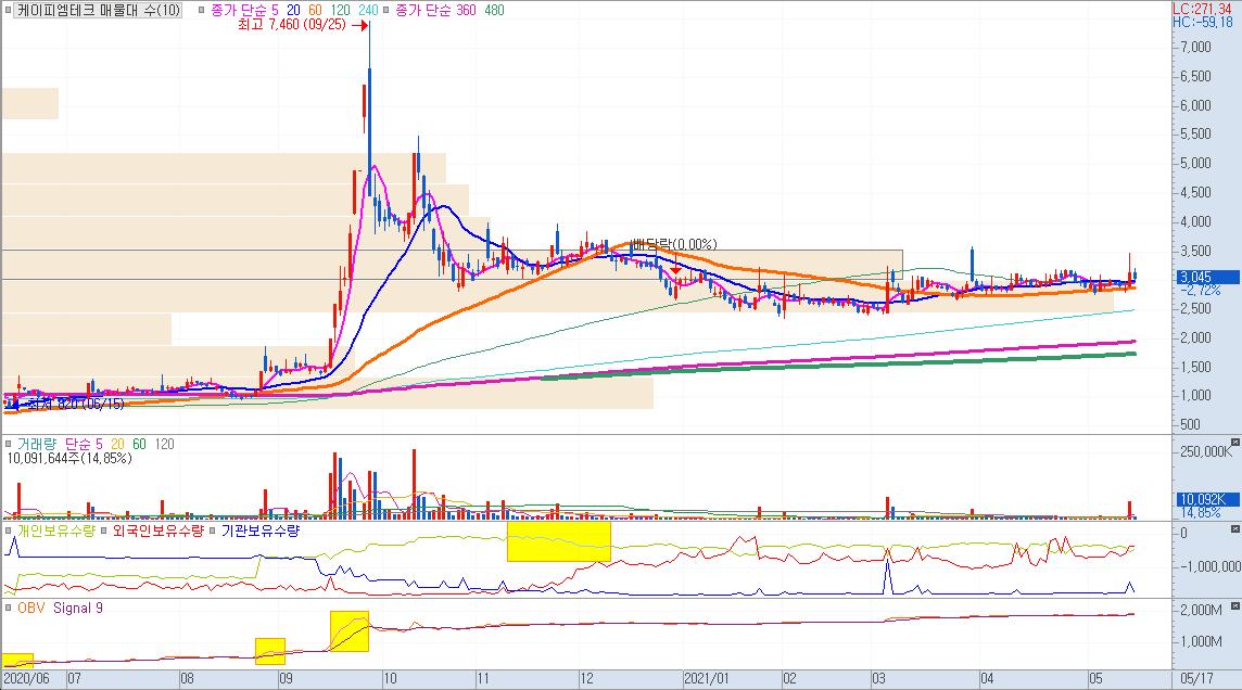 이런 와중에 케이피엠테크에는 이전 거래량 대비 1000% 이상의 대량 거래량이 들어옴으로써 급등주 패턴에 필수인 대량 거래량 유입 시그널을 남겼다.
