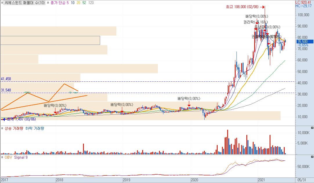 현재 친환경 관련주 중에서 대형주에 속하는 종목들이 눌림목 조정을 주고 있어 좋은 매수 기회를 주고 있다고 본다면 지금이 투자의 적기일수 있겠다. 장기 투자 종목 모멘텀에 속한 친환경 관련주라 주봉차트로 살펴보도록 하자.