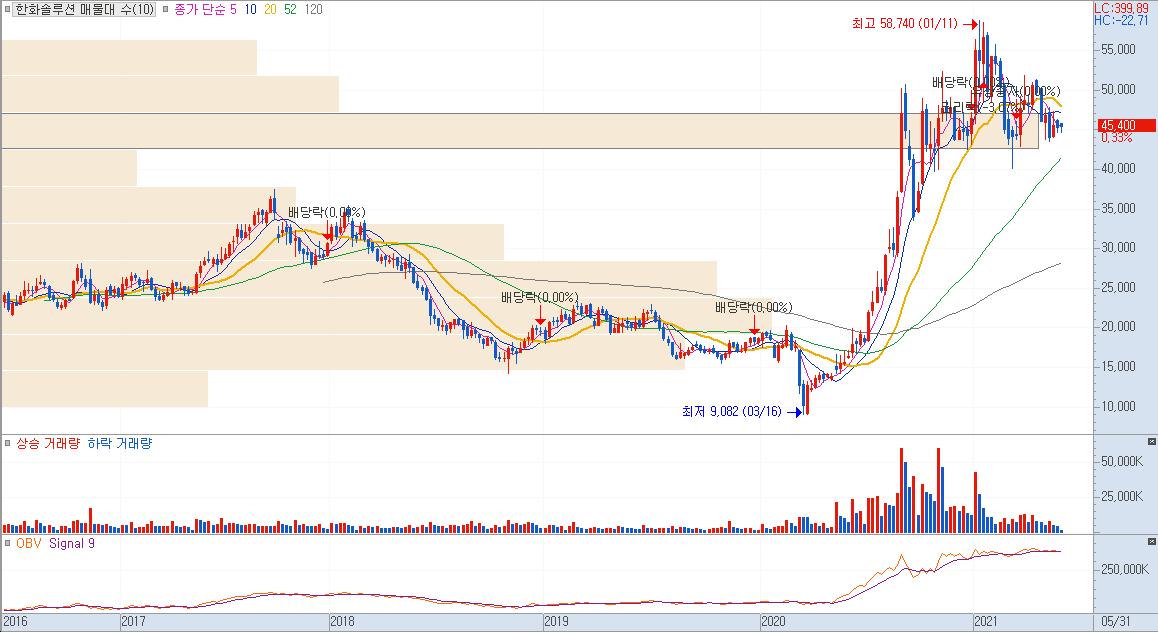 태양광 발전 관련주 중에서 중대형주에 속한다. 한화 그룹전체가 수소사업을 새로운 성장동력으로 삼으면서 대대적인 투자를 하고 있다.