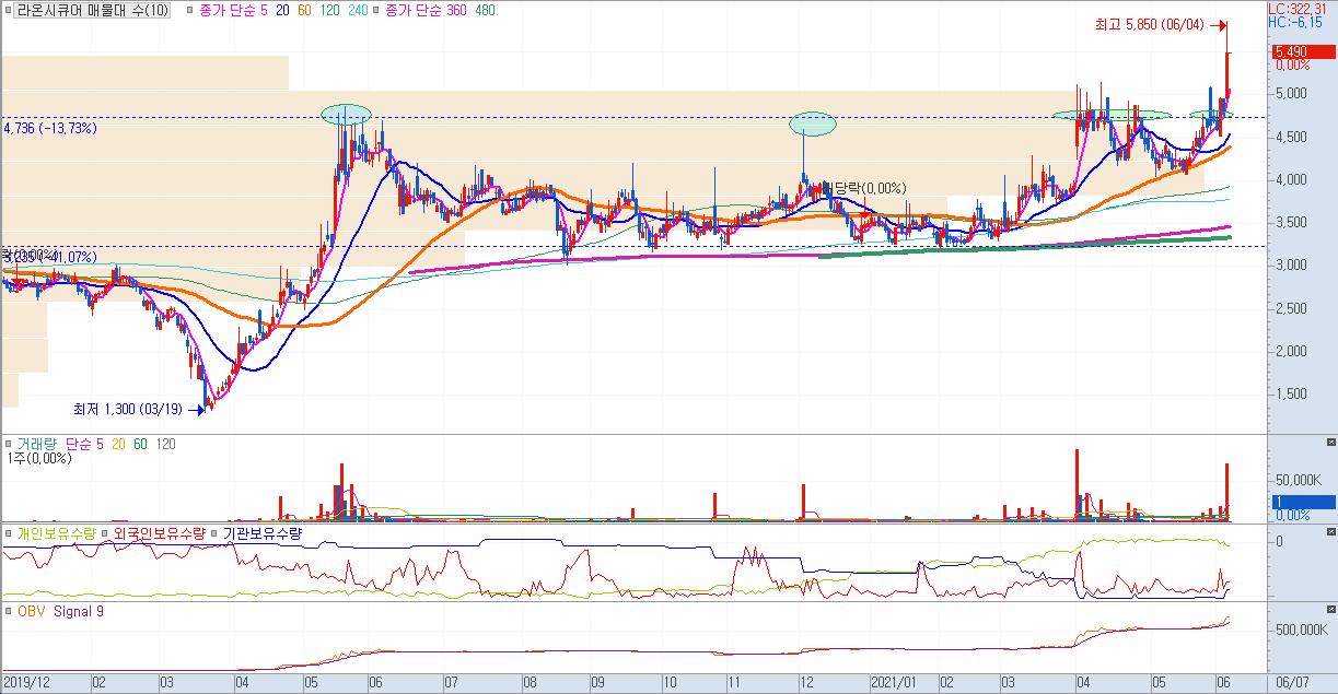 라온시큐어의 일봉차트를 보면 코로나 이후 약 1년 동안 박스권 횡보를 하면서 4700원대의 박스권 고점을 여러차례 공략하며 매집봉들이 출현했다.