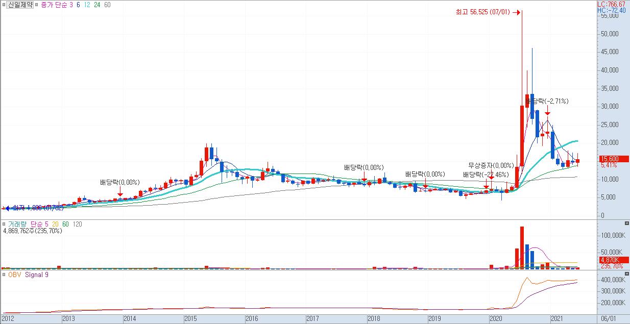 월봉차트를 보면 한차례 대파동을 준후 조정하랄 중인 종목이다. 바닥권에서 주가가 대략 5배 가량 상승후 현재는 조정하락 구간에 있어, 특별한 모멘텀이 없다면 신풍제약처럼 매물대 소화기간이 필요하다.