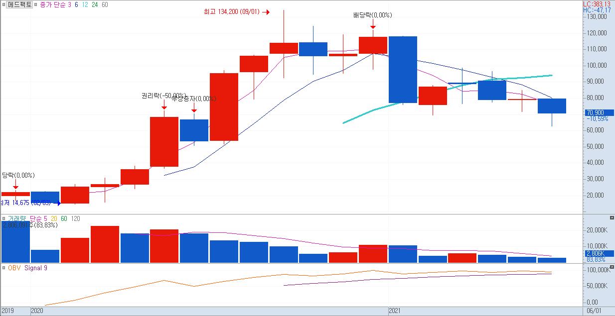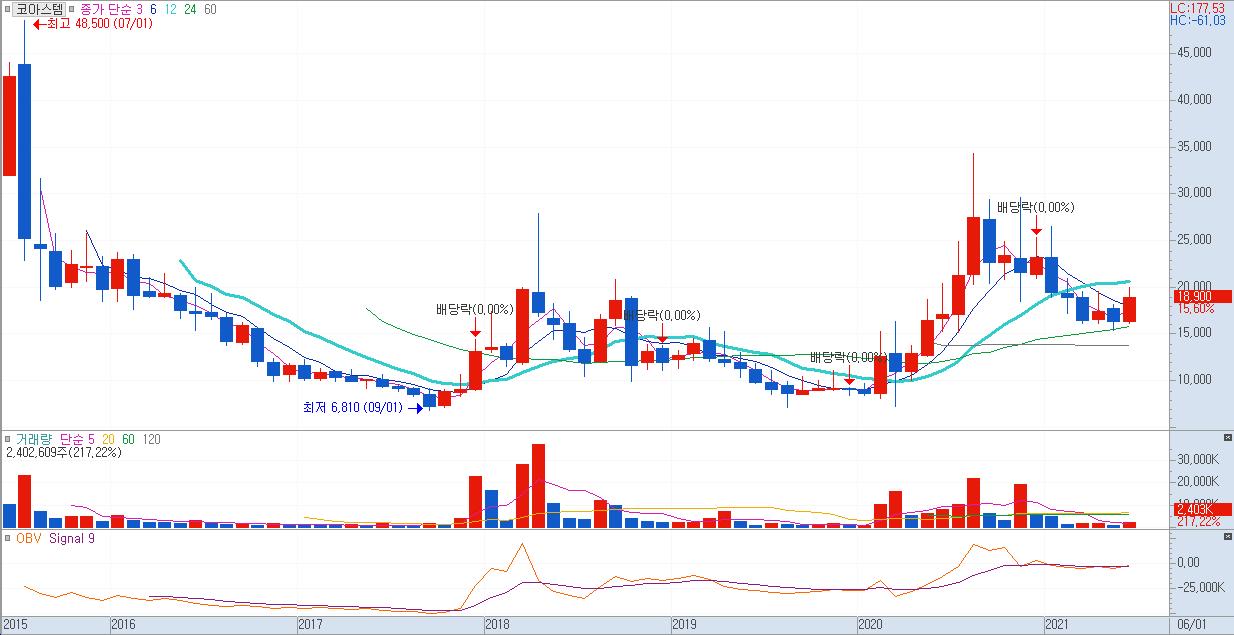 한차례 10배이상 급등했던 종목이다. 시장에서 뜨거운 종목이었고 급등후 하락중에 있어 당분간 매물대를 소화하려면 오랜 기간이 걸릴것으로 보인다. 주식 투자 초보라면 이런 종목은 앞에서 쌓인 매물대 소화기간이 여려해 걸릴수 있음을 알아야 한다.