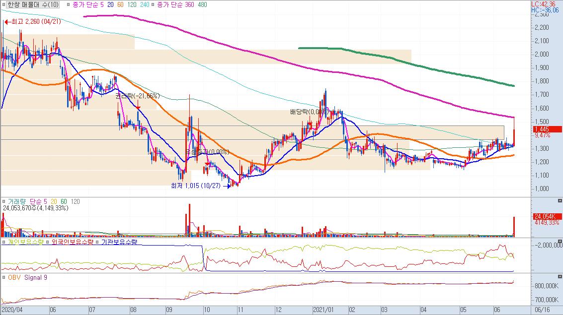 한창의 일봉차트다. 주가가 저가권에서 대량 거래량이 유입되었다. 테마자체가 독립된 단위 테마라 파워있는 테마가 될지는 미지수다. 단기 전고점대까지는 한번 공략해 볼만한 주가 위치.