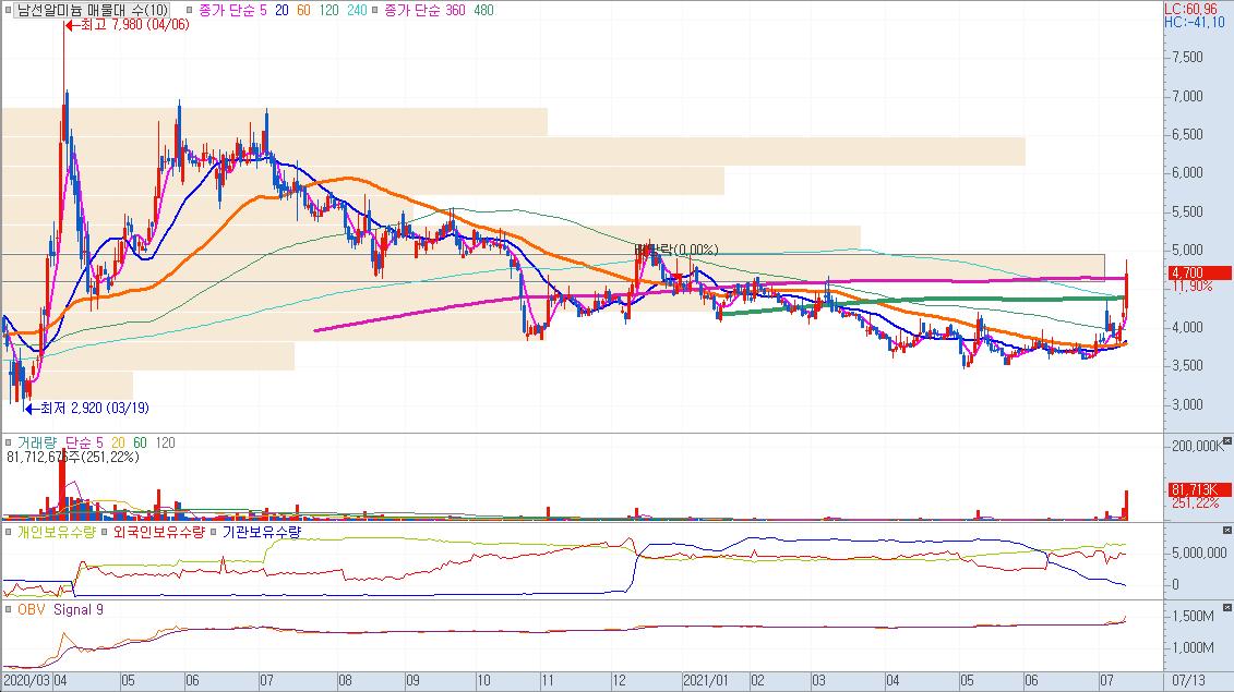 남선알미늄의 주봉차트다. 주가가 조정받는 구간에서 급등이 나오고 있다. 일봉차트로 보자.