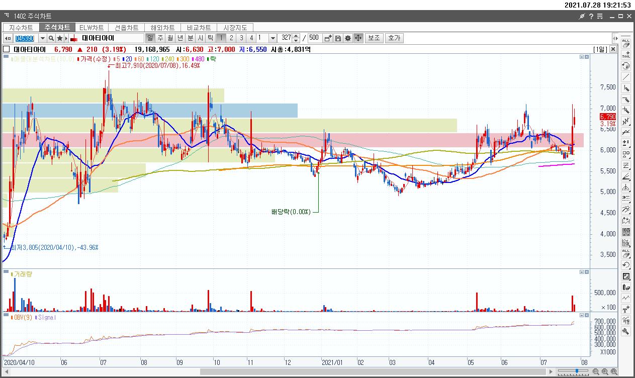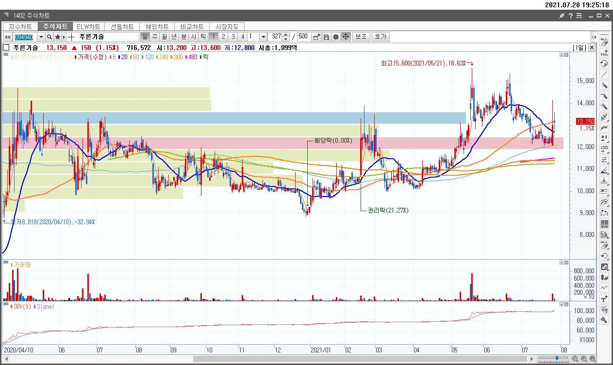 푸른기술은 철도 관련주 중에서 역무 자동화 관련 기업이다. 급등주 패턴을 자주 보여주는 끼있는 종목으로 현재 주가가 주요매물대 상단과 20일이평선을 주가 바로 아래 지지선으로 두고 있어 눌림목 매매로 투자전략을 세울수 있는 구간.