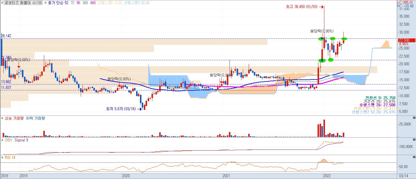 로봇 관련주 섹터는 국내 굴지의 대기업들이 모두 뛰어들고 있는 신사업 분야에다가, 새로 출범하는 윤석열 정책 관련주에 속하고 있어 정권 출범전까지 정책관련주로 한차례 급등할 가능성이 좀더 높아 보인다.
