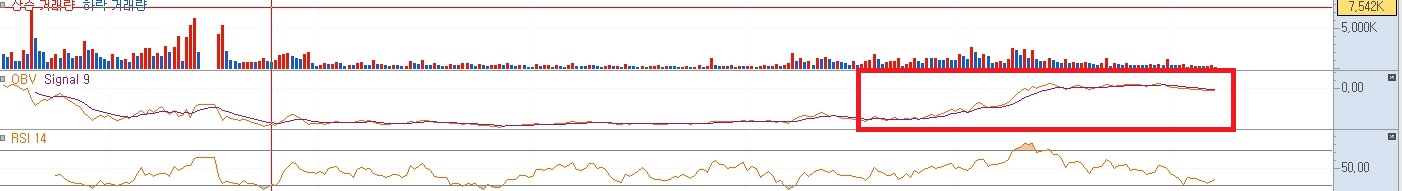 거래량은 횡보구간에서 하락구간 보다 증가하고 있다. 그리고 OBV 누적거래량을 봐도 주가의 바닥구간에서 매수량이 증가하고 있다.