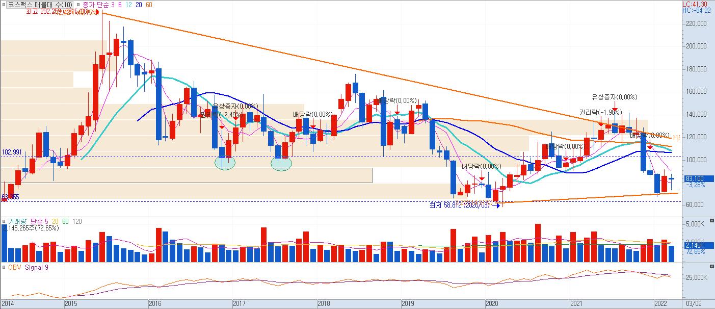 매출과 영업이익이 꾸준히 증가하고 있는데 비해 월봉상 주가 차트를 보면 2015년 최고점대비 약 -70%이상 하락한후 현재 쌍바닥을 형성하는 저가 매수 구간이다.