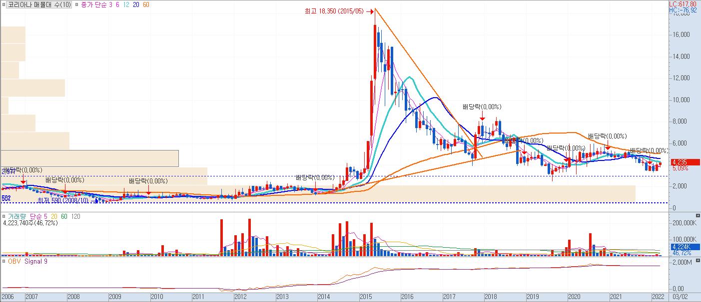 코리아나의 월봉차트다. 최고점이었던 18000원대에서 약 -80%이상 주가가 하락한 이후 쌍바닥을 형성하며 저점을 확인했다.