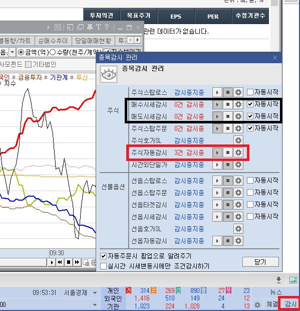 위의것은 내 컴의 HTS가 켜져있을때만 작동하는 것이고 아래쪽의 빨간 박스에 있는 메뉴는 내 컴이 켜져있는지와는 무관하게 내가 설정해 놓은 기간 동안, 원하는 가격대가 오면 증권사 서버에서 자동으로 매수와 매도가 이루어지는 메뉴다. 내 컴이 꺼져 있어도 자동매매를 원한다면 빨간색 박스안 '주식자동감시' 메뉴의 바뀌모양을 클릭한다.