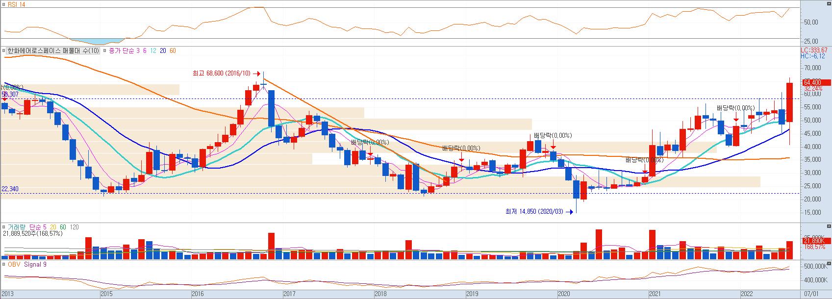 러시아 우크라이나 전쟁을 계기로 K9의 수출 증가에 이어, 고등훈련기 및 FA-50의 수출시장이 열리면서 한화가 방산부문의 그룹사를 한화에어로스페이스로 모두 통합하면서 미국 록히드마틴과 같은 전문 방산업체로 전환을 준비하고 있어, 앞으로의 주가 변화가 기대된다.