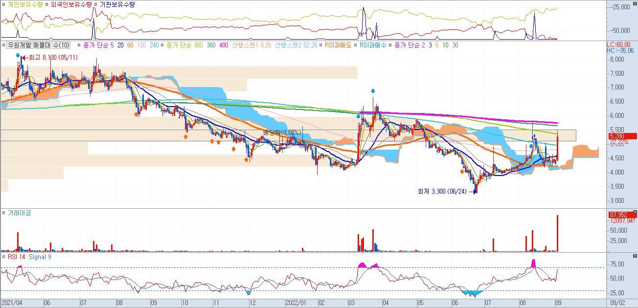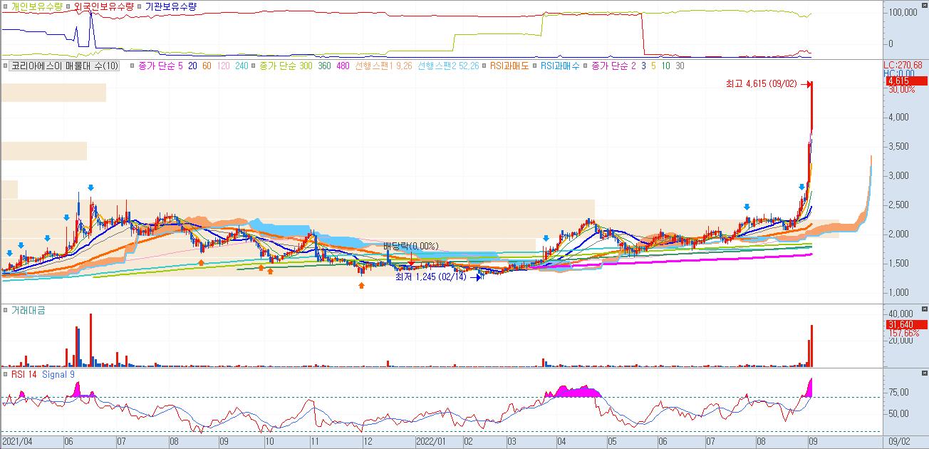 태풍 힌남노가 우리나라를 통과할 것으로 예고되면서 태풍 피해복구 관련주가 오늘의 주도주 섹터를 차지하였다. 태풍 관련주 중에서 오늘 가장 큰 상승을 보여준 급등주는 코리아에스이다.