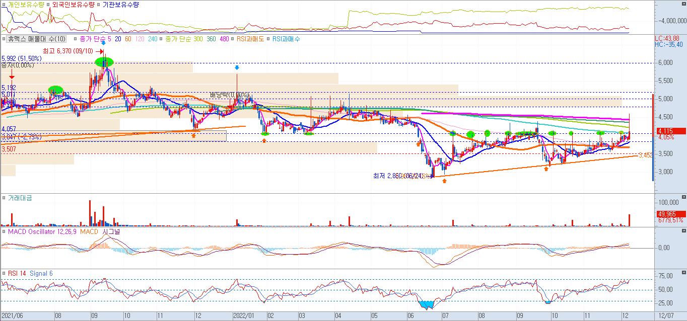 휴맥스는 올해 하반기 내내 주가가 4000원대 저항대를 형성하며 등락을 반복해왔다. 꾸준한 매집이 이루어지다 오늘 장중6개월 동안의 고점을 돌파하는 대량거래량을 동반한 급등이 나온후 전고점대에서 주가가 종가마감했다.