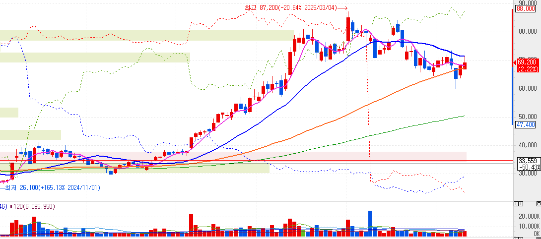 주가 상승 전망은 명확하지만, 투자 시점을 고려해야 하며, 주포는 외인과 기관이라는 점에 주목해야 합니다. 장기적으로 주가에 영향을 주는 재료가 워낙 강력하기 때문에 상승에 비중을 두어야하지만, 현재 시장의 상황이 매우 강력한 하락파동에 놓여있으므로 분할매수 관점으로 눌림목 공략이 필요하다고 보입니다.