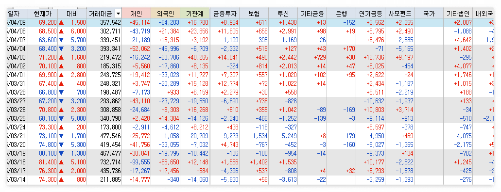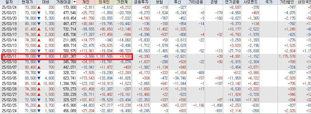 앞의 차트에서 보면 붉은색 점선이 외국인의 보유수량인데 3월11일 급격한 매도를 볼수 있습니다. 투자자별 매매동향 차트를 보면 빠져나간 물량을 볼수 있습니다. 그리고 60일선 반등지점에서는 기관의 연이은 매수세가 들어오는 것을 볼수 있습니다.