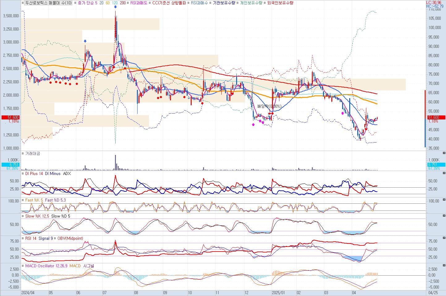 일봉상 차트에서는 여전히 60일 중기 이평선이 하락추세에 있고, 20일 이평선도 하락세에 있습니다. 여기에 주가의 추세를 돌려주는 대량 매수세가 아직 나오지 않아, 두산로보틱스를 투자에 염두하고 있다면 대량거래후 주가 추세가 우상향으로 돌아서는 초기 단계에 진입하는 것이 좀더 투자에 좋은 타이밍일 것입니다.