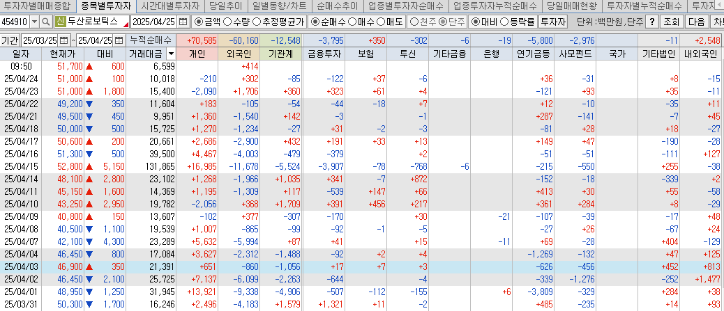 기관도 지속적인 매도세가 지속되고 있습니다. 두산로보틱스의 주가는 기관과 외국인의 매매성향에 따라 주가가 연동되고 있으므로 기관과 외인의 투심을 잘 관찰할 필요가 있을것으로 보입니다.