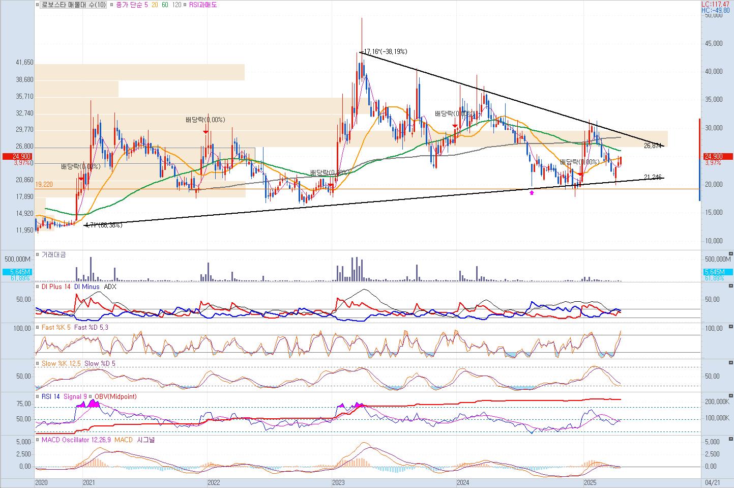 로보스타 주가는 장기적인 고점이 낮아지고 있으나 저점은 지속적으로 높아지면서 상승하고 있는 모습입니다. 고점 추세와 저점추세가 수렴하는 구간이 가가워 지고 있어, 조만간 주가의 큰 변동이 다가올 수 있는 패턴입니다.