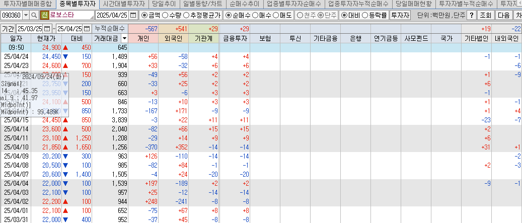 외국인은 최근 급격히 매수세 증가를 보여주며 로보스타를 매수하고 있는 모습입니다., LG전자의 사업 확장 소식으로 매수 전환 가능성이 높아지고 있습니다.
