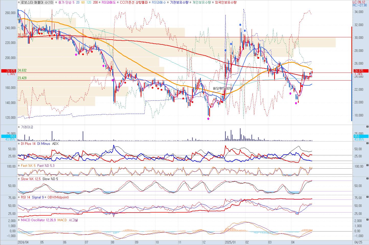 4월25일 현재 시점으로 RSI는 약60으로 상승세를 나타고 있어 60이평선을 돌파해서 상승 할 가능성도 있습니다 . 저항선은 대략 전고점인 3만 원, 혹은 2.7만원, 지지선은 2.2만 원 수준입니다. 테슬라 옵티머스 관련 뉴스가 추가 호재로 작용할 경우, 4.5만 원 까지 상승을 기대할 수 있습니다.